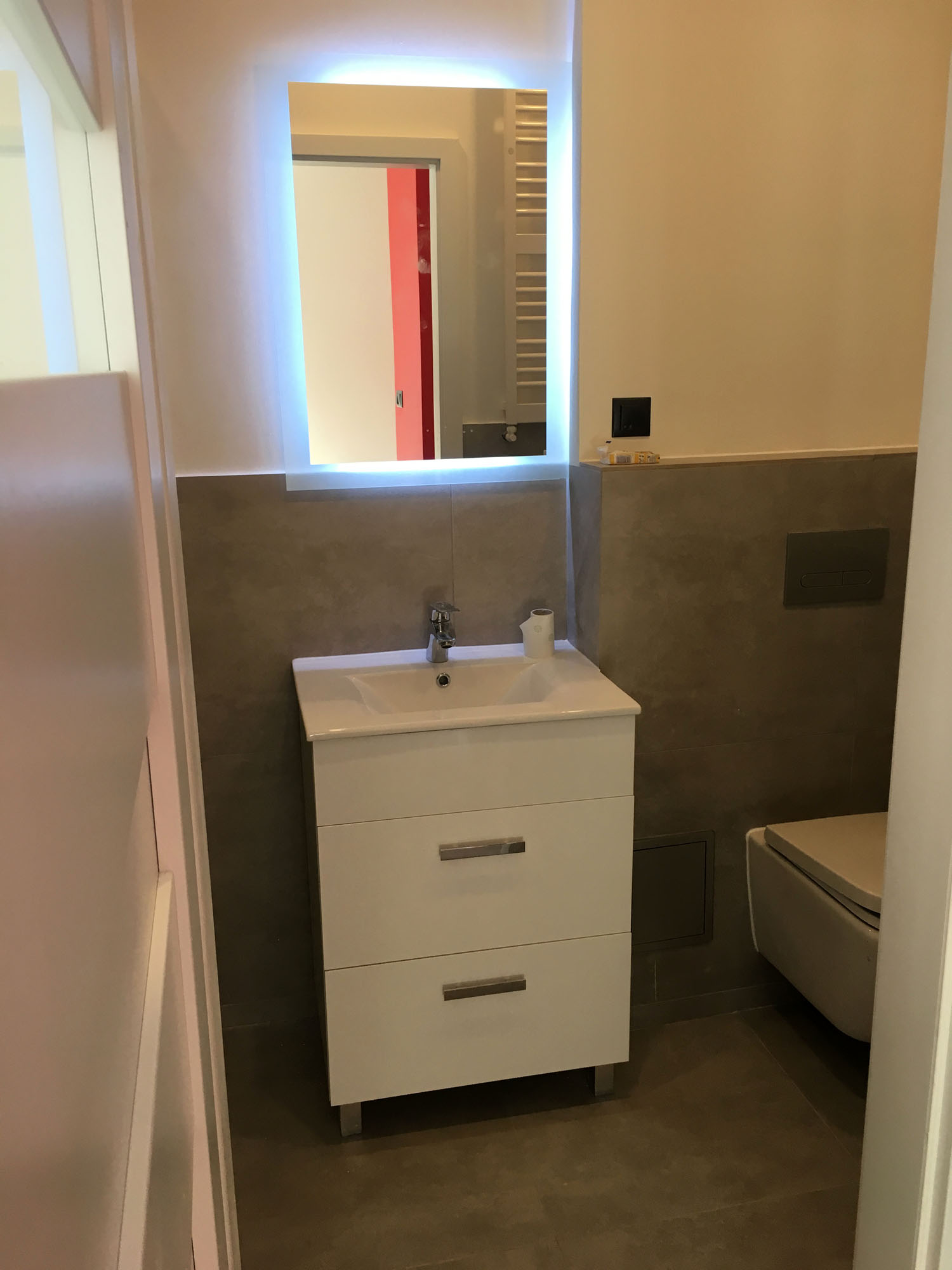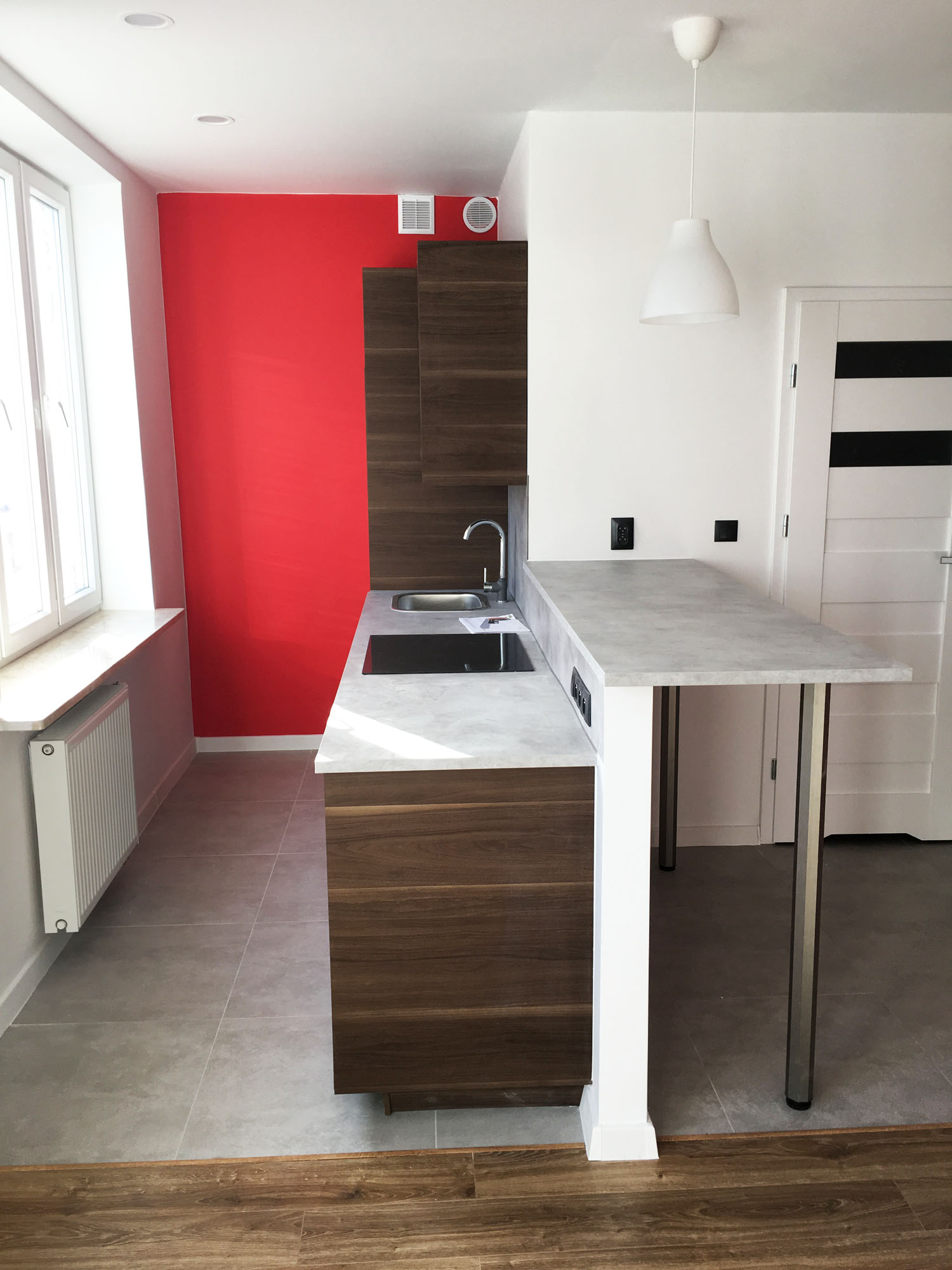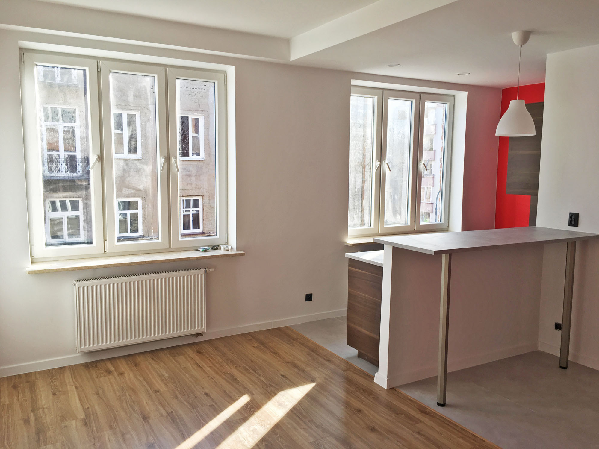 Kawalerka (ok. 30 m2) – kameralne studio idealne dla 1 lub 2 osób, zaprojektowane bardzo funkcjonalnie: rozkładany narożnik, szafa wnękowa, aneks kuchenny z barkiem i wysokimi krzesłami, lodówką, płytą grzewczą oraz elektrycznym piekarnikiem, łazienka: prysznic, WC, umywalka oraz pralka.
